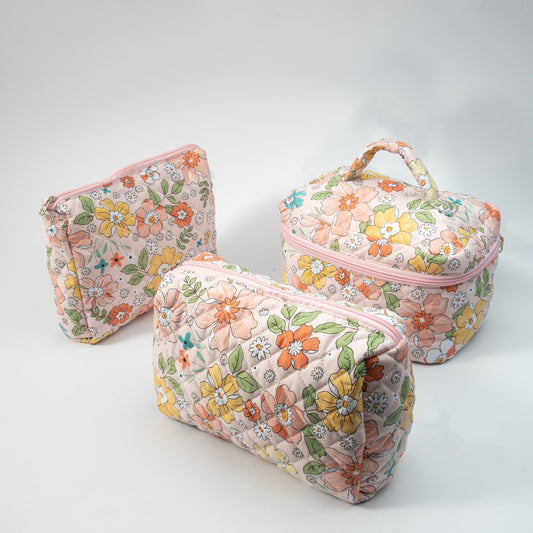 Floral Quilted Makeup Pouch - Travel-Friendly Cosmetic Bag