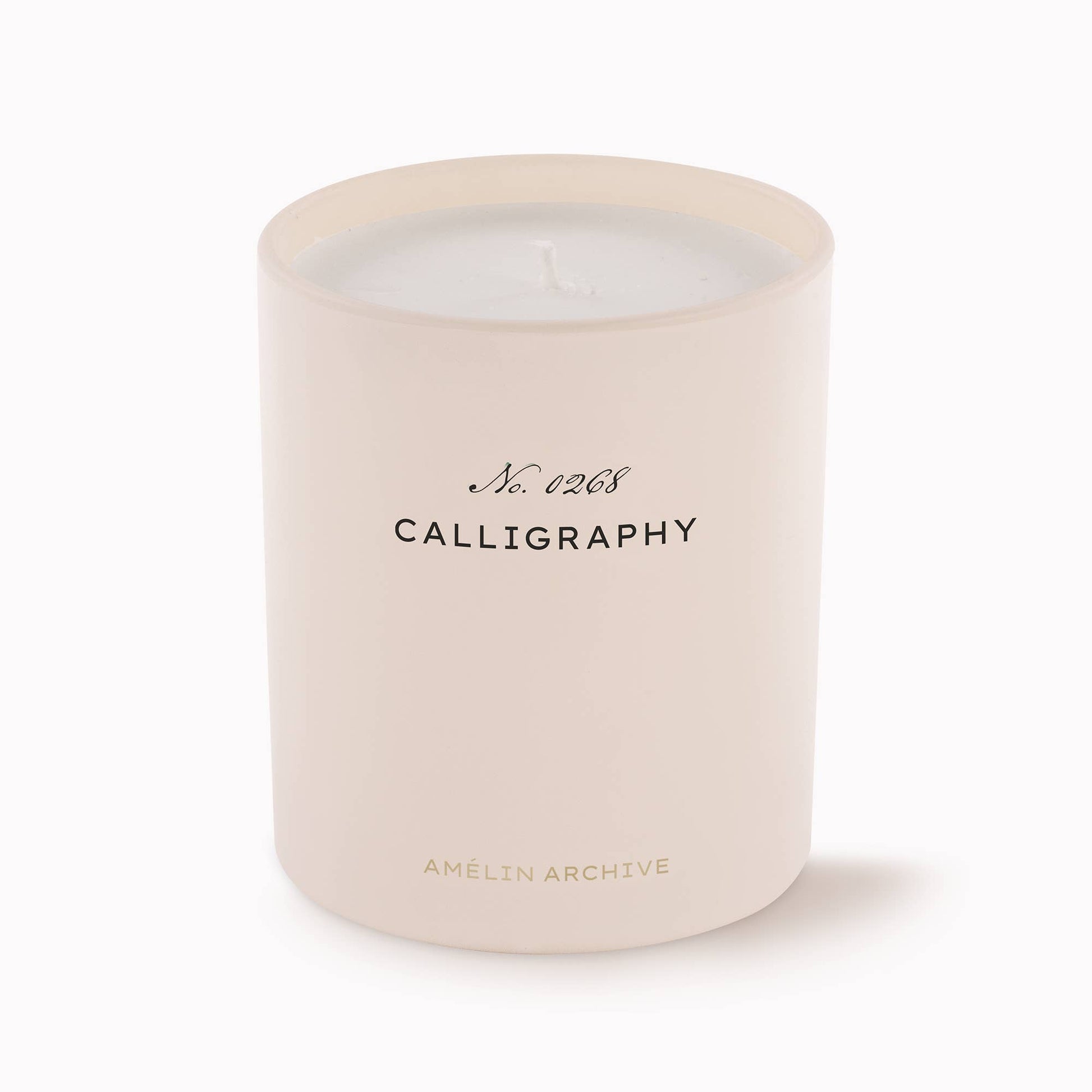 Green mandarin top notes blended with Sweet Violet, Amber, and Smokey Cedar. Our Calligraphy candle is designed to conjure the eloquence of a bygone era when more than mere moments were dedicated to hand written notes and the Art of exquisite penmanship. The distinctive 2 piece paper wrapped presentation box make a great gift. The intentionally minimal vintage cream glass vessel is subtle enough to display in any home.