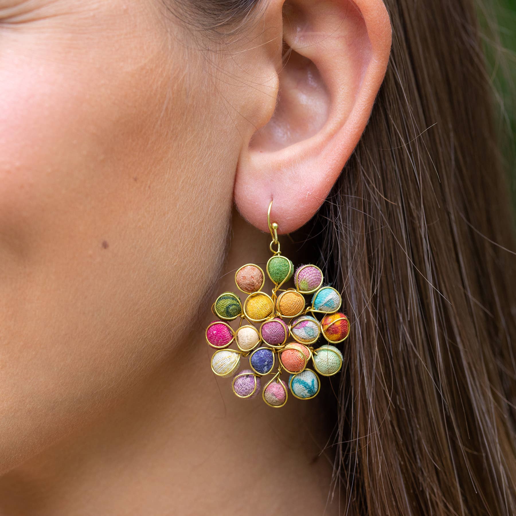 "Aasha" means hope in Hindi. Aasha is a 100% sustainable jewelry line made by an artisan group of economically disadvantaged women. Using discarded saris and wrapping them over small wooden beads these women are able to create a very unique and colorful collection of jewelry. The wooden beads are scraps sourced from furniture factories nearby, and the fabric used to cover them comes from old, worn saris, collected all over India! No two beads will be the same.