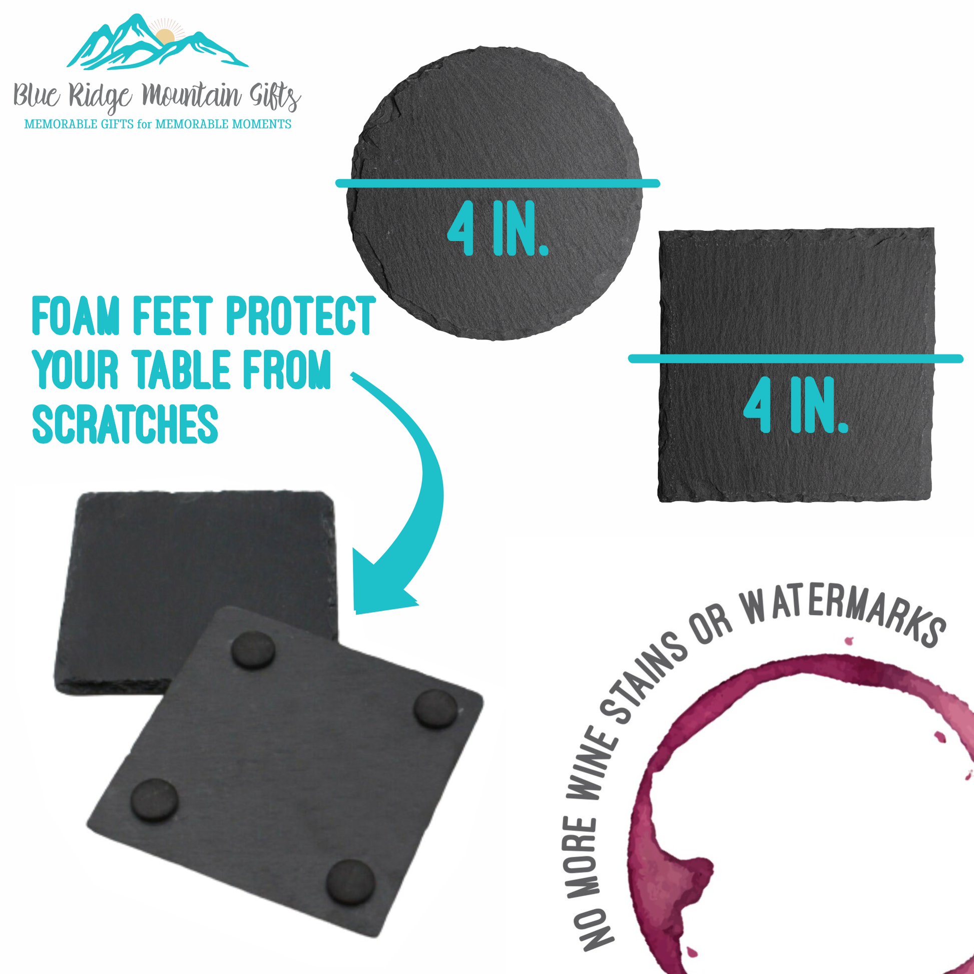 To ensure the protection of surfaces, each coaster is equipped with foam feet that prevent scratches and provide stability. With their combination of quality craftsmanship, striking design, and practicality, these slate coasters are a must-have addition to any store's inventory.