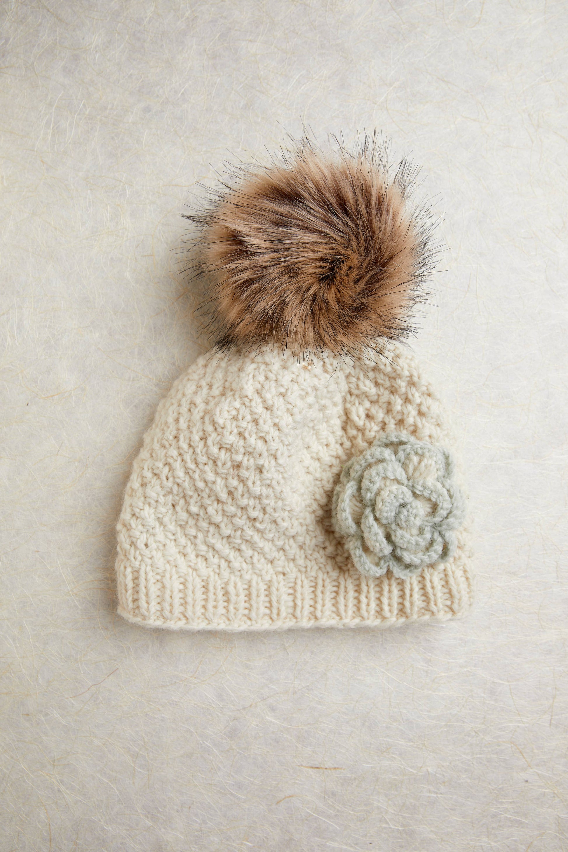 Each piece is handmade in Nepal by skilled artisans with wool and fleece lining. The process involves dying the wool fibers with azo free dyes, hand knitting the fibers and adding a warm and comfortable fleece lining. A hand crocheted flower and faux fur pom are the final touch. In the end, the fibers come to life as unique knit accessories!