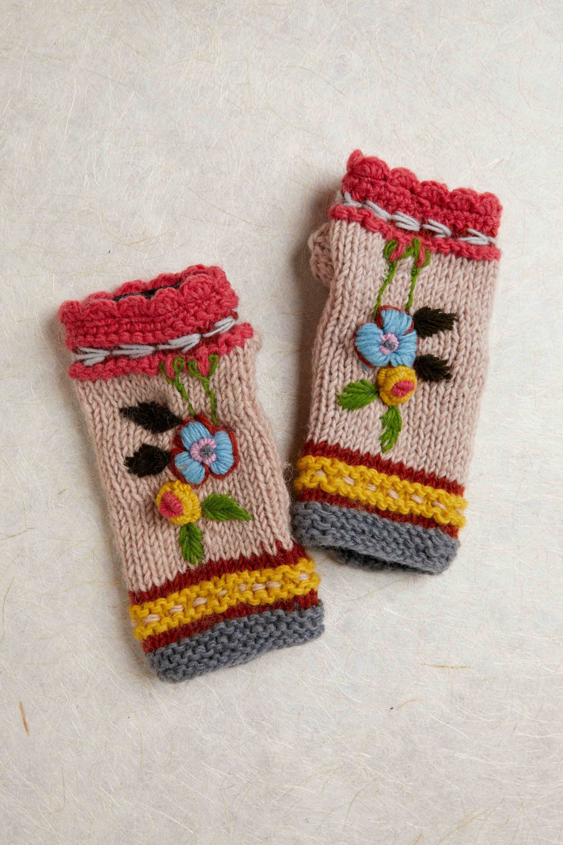 Each piece is handmade in Nepal by skilled artisans with wool and fleece lining. The process involves dying the wool fibers with azo free dyes, hand knitting the fibers and adding a warm and comfortable fleece lining. Hand embroidered flowers are the final touch. In the end, the fibers come to life as unique knit accessories!