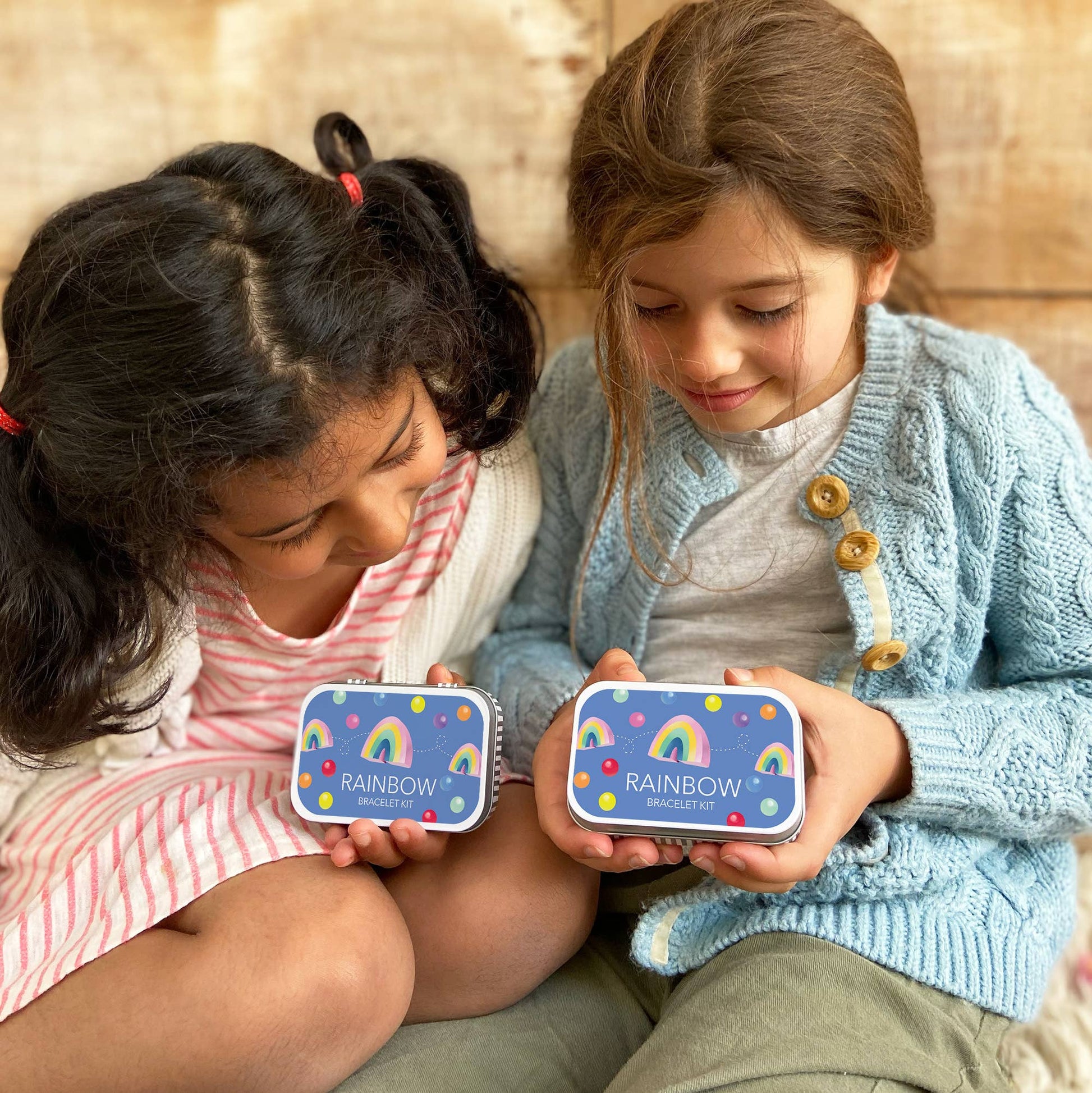 A beautiful gift tin containing elastic & beads to create this rainbow bracelet. The elastic comes with metal ends to aid the beading process for young children.