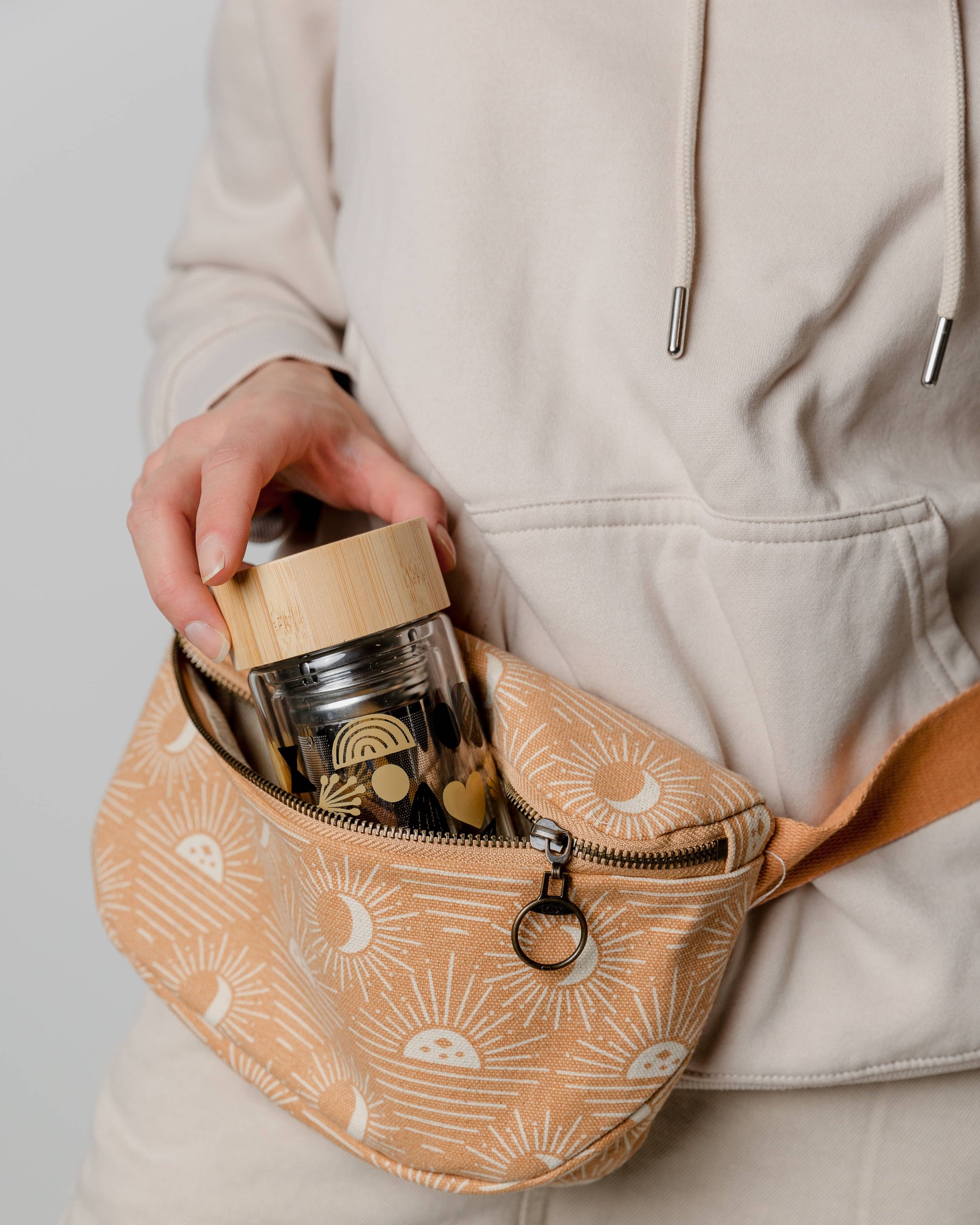 Art Deco-inspired arrangements of off-white radiating suns and crescent moons on a terracotta surface lend energetic charm and a distinctive look to this Soleil Hip Bag by Danica Studio. Stride into the market with confidence with a durable artisan-designed hip bag around your waist. Perfectly on-trend, this 90s throwback is the accessory your retro-loving self has been waiting for.