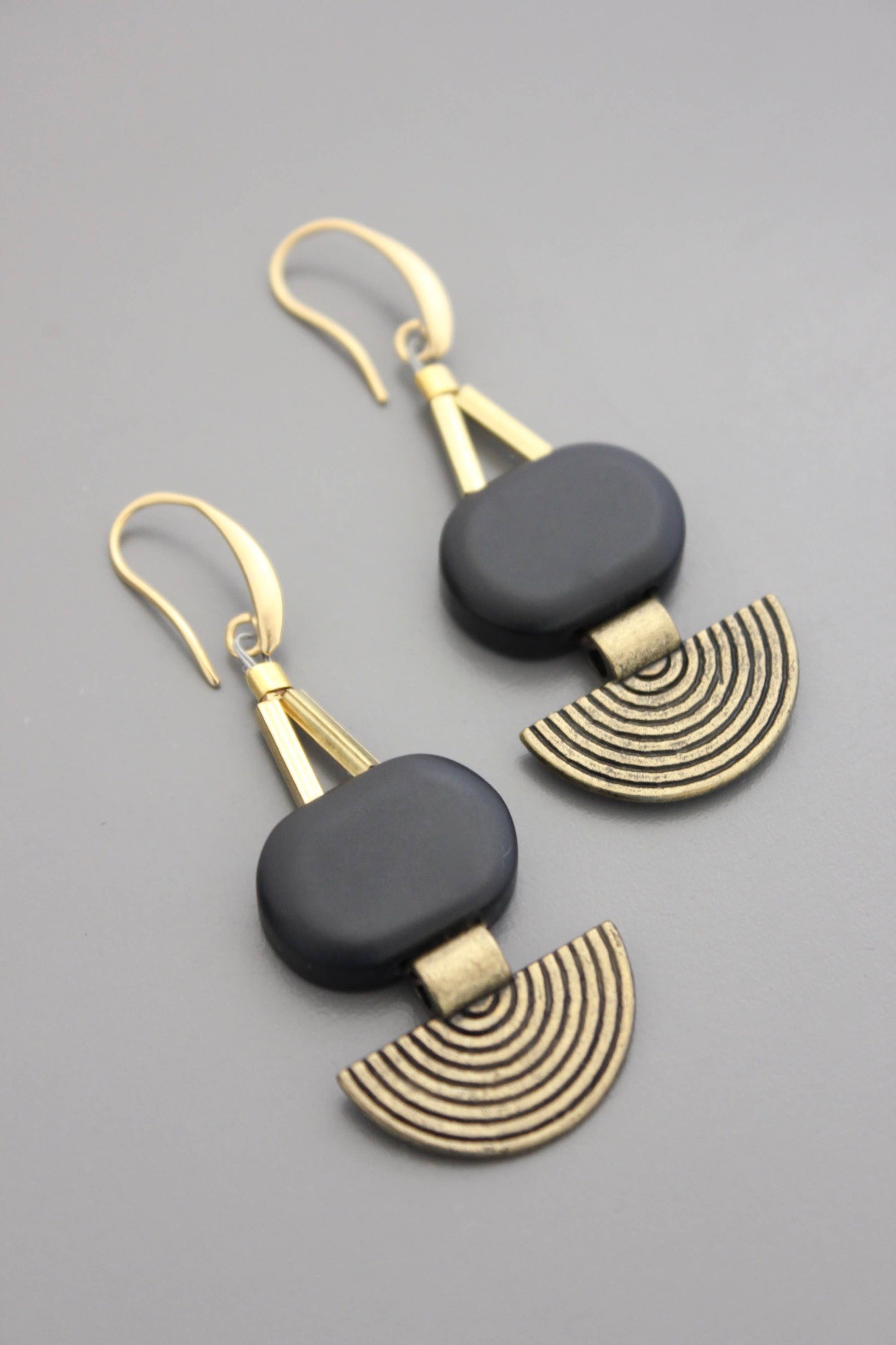 18k gold plated hook earrings with black agate and brass. 2.25 inches.