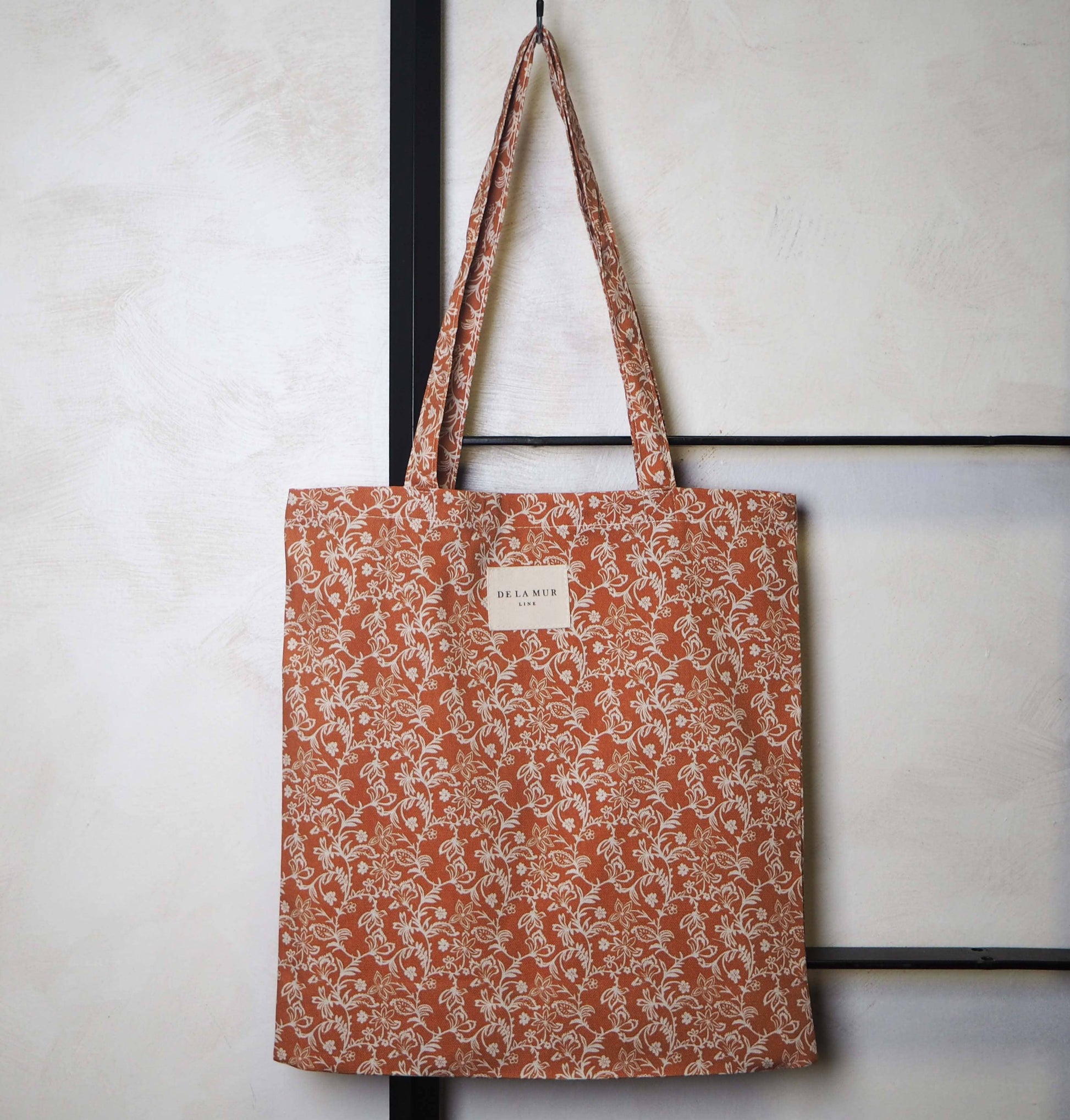 Bolsa “tote bag” con asas para llevar al hombro. Con tejido estampado floral con fondo anaranjado. Para su correcto mantenimiento se aconseja lavarlo en frío y no utilizar secadora.