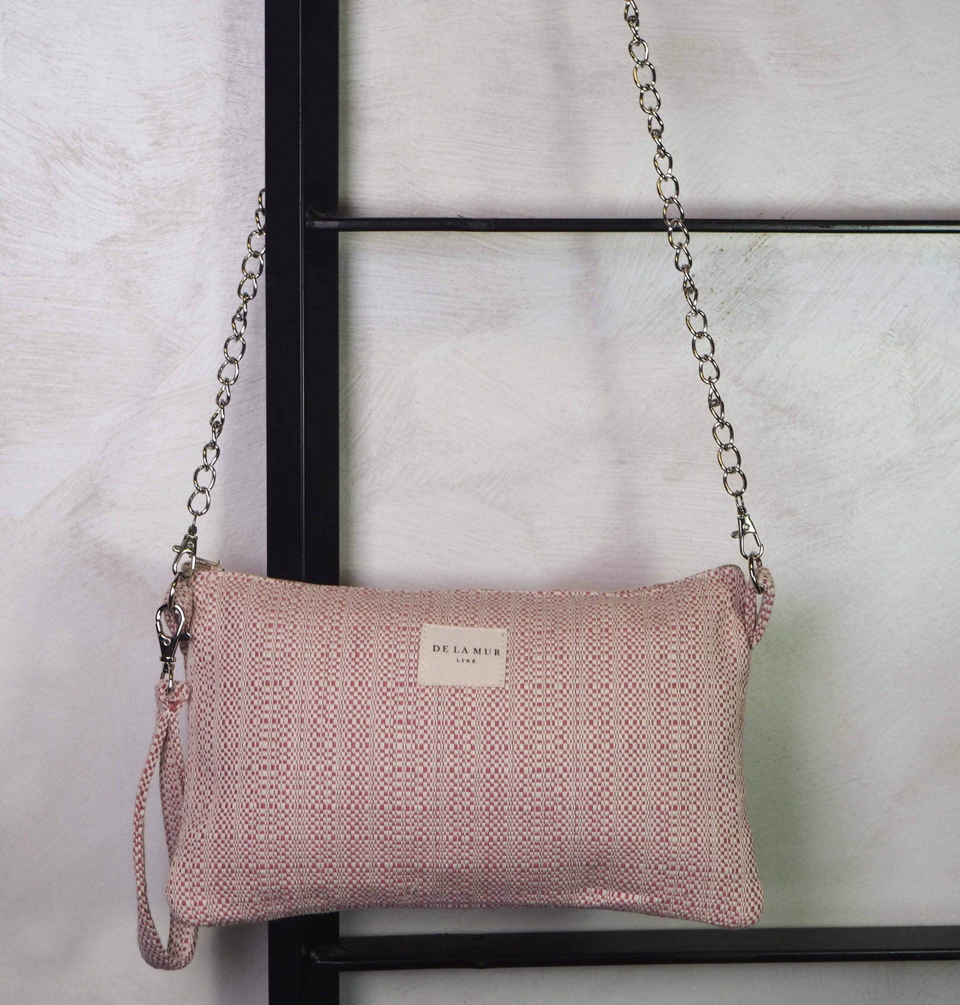 Bolso tipo “Clutch” con asa de cadena de color plata y con asa pequeña en el lateral extraíble para llevar en la muñeca. Con tejido con muestra en tono rosa claro. Para su correcto mantenimiento se aconseja lavarlo en frío y no utilizar secadora.