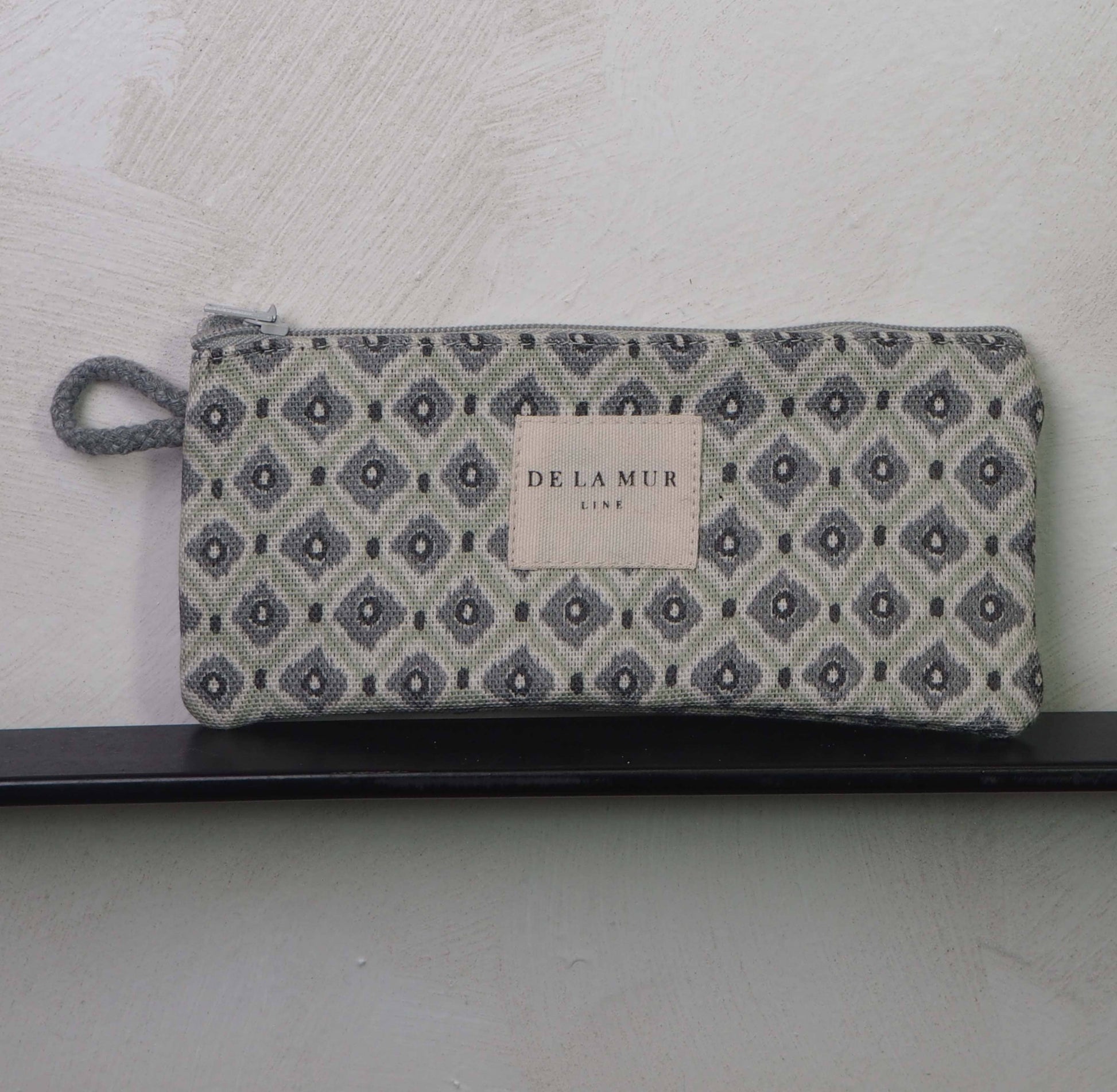 Funda de gafas con cremallera en la parte superior y pequeña asa de cordón de color gris en el lateral. Con tejido con estampado geométrico con tonos grisáceos y verdes. Para su correcto mantenimiento se aconseja lavarlo en frío y no utilizar secadora.