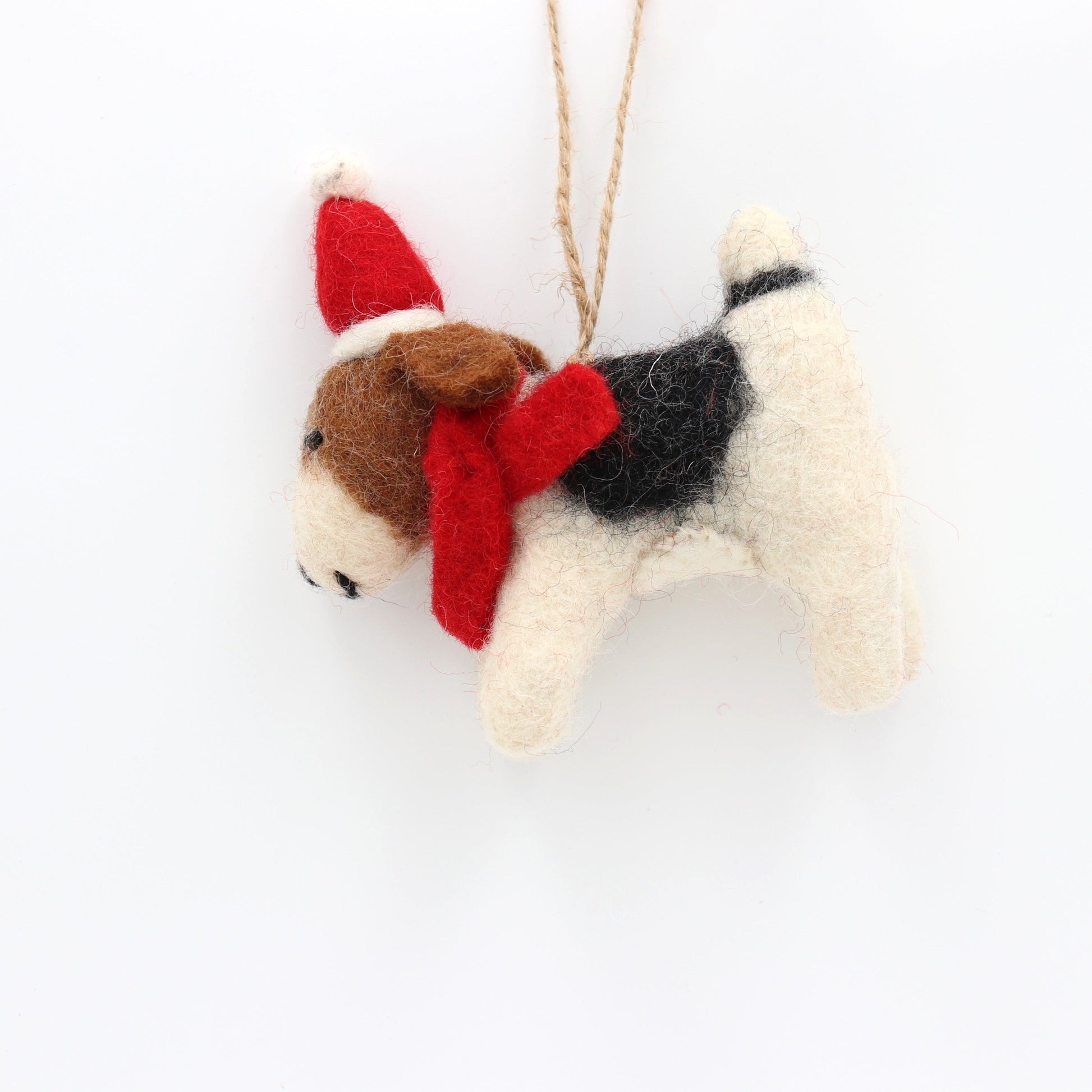 Made from soft wool and shaped entirely by hand, this festive holiday pup features embroidered details, a cozy red scarf, a tiny Santa hat, and a sturdy hanging loop ready for your Christmas tree. Perfect for dog lovers, stocking stuffers, or anyone who enjoys handmade holiday charm. This ornament is lightweight and durable, making it simple to hang without weighing down branches.