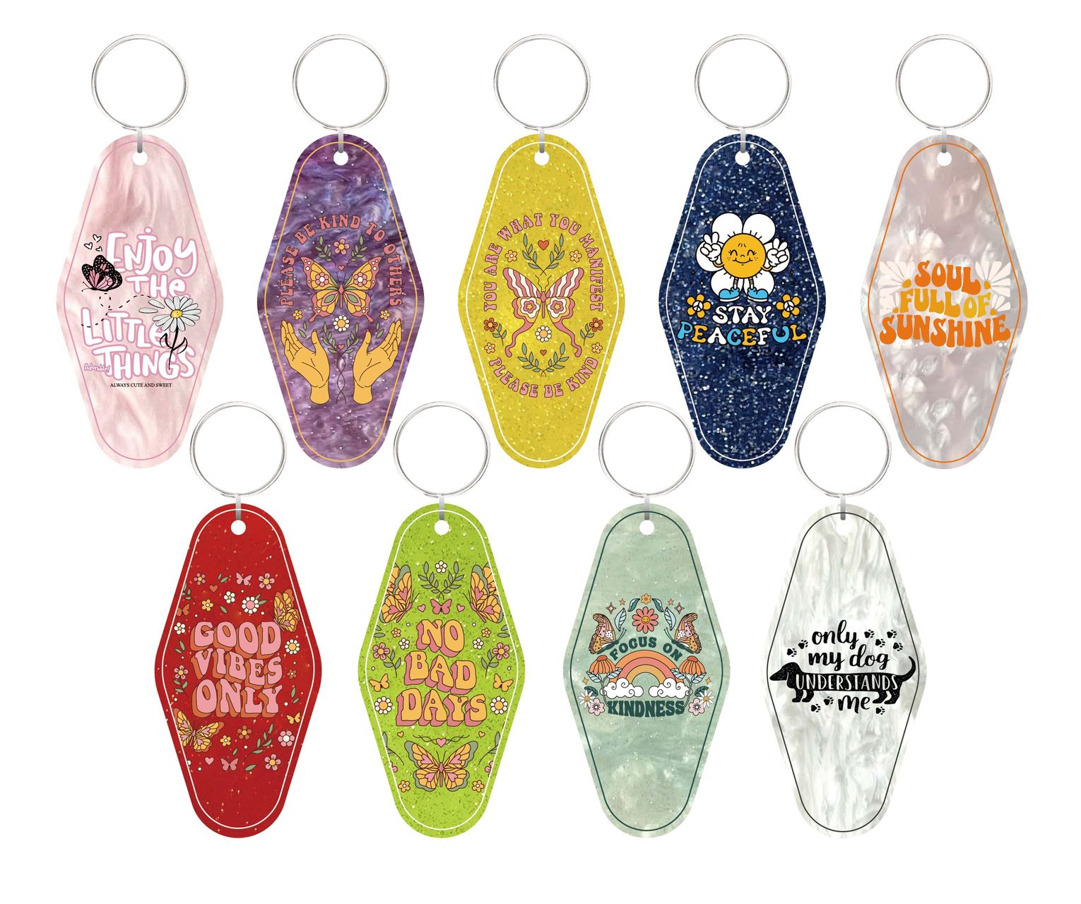 Evoke the nostalgia of classic roadside hotels with this charming, vintage-inspired keychain with a boho aesthetic. Crafted from sturdy acrylic that is sure to last, this 70s-inspired keychain is a practical and stylish addition to your keyring.