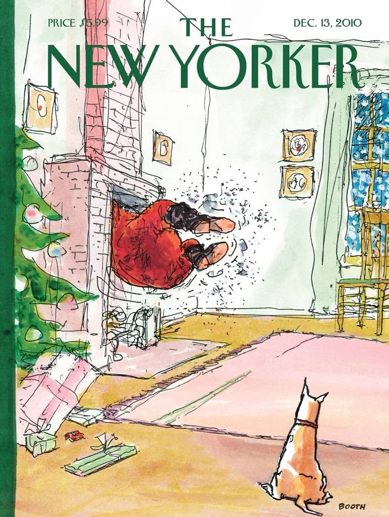 A curious dog observes Santa's bumpy ride down the chimney.