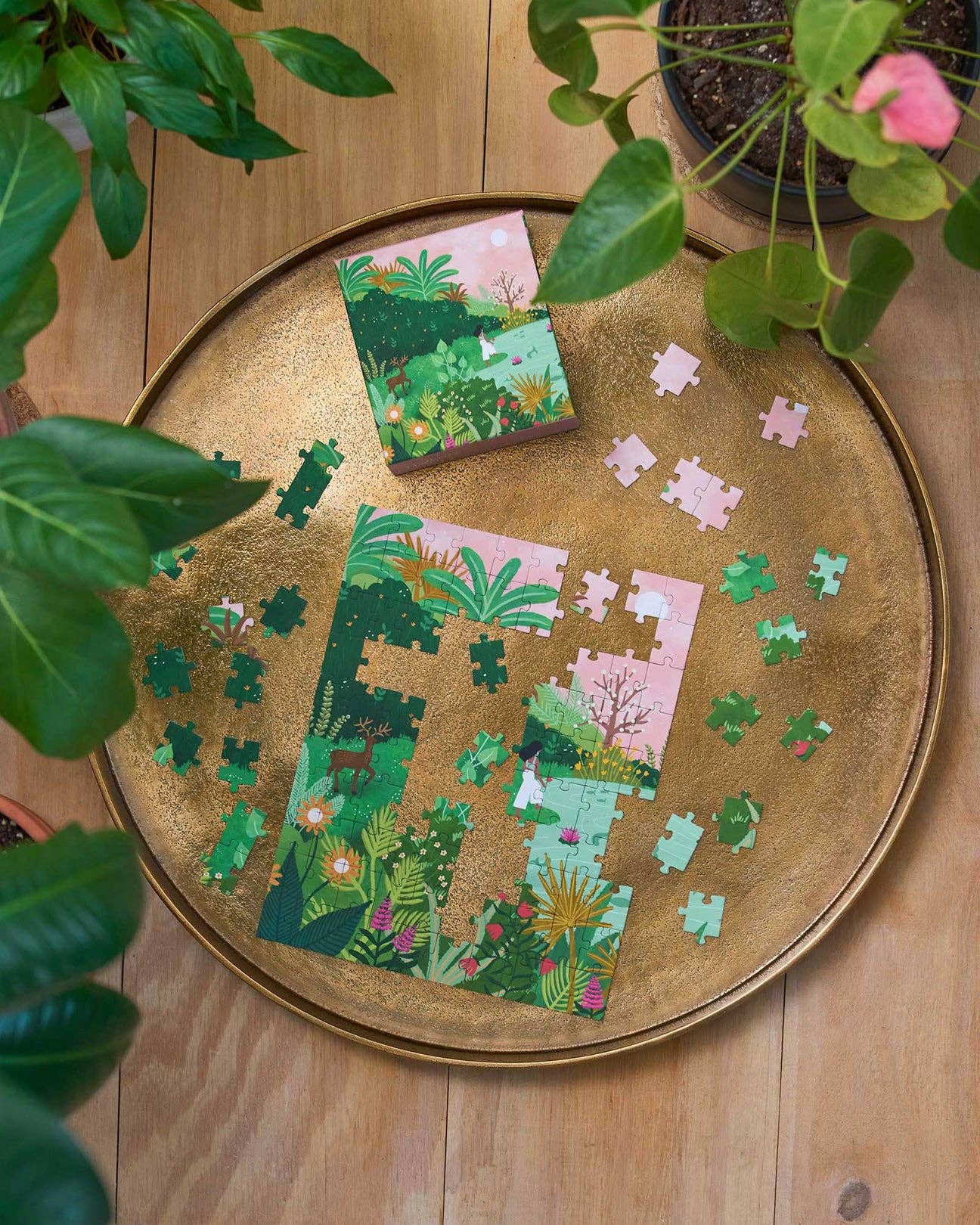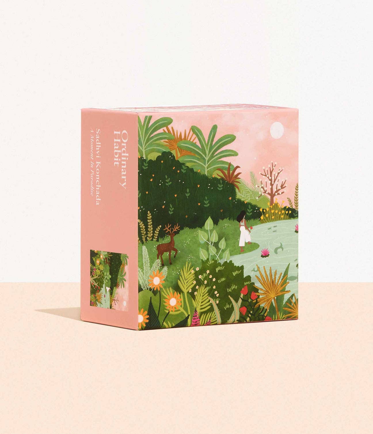 A gentle deer companion follows her companion in this beautiful puzzle by Indian illustrator Sadhvi Konchada. Cheery and bright, find yourself in paradise as you bring this artwork to life.