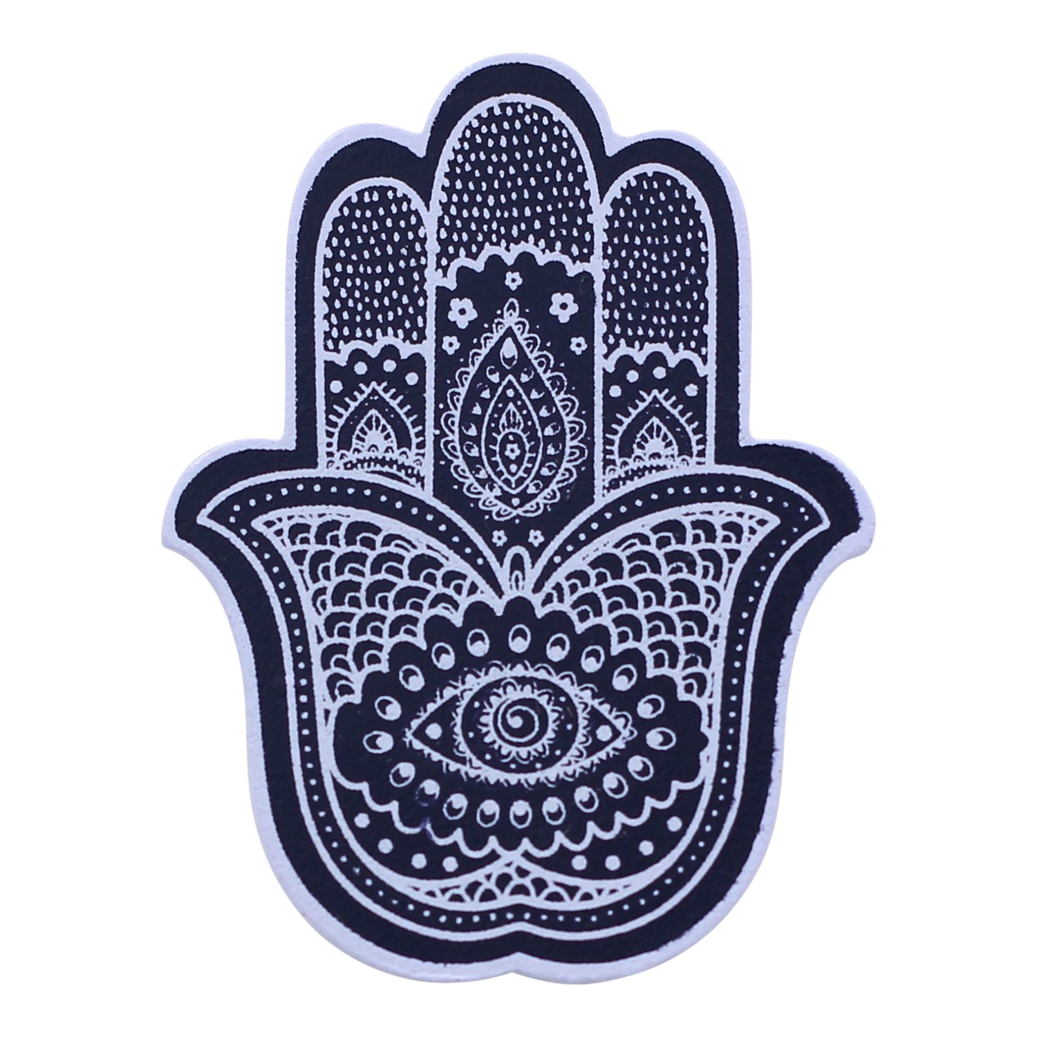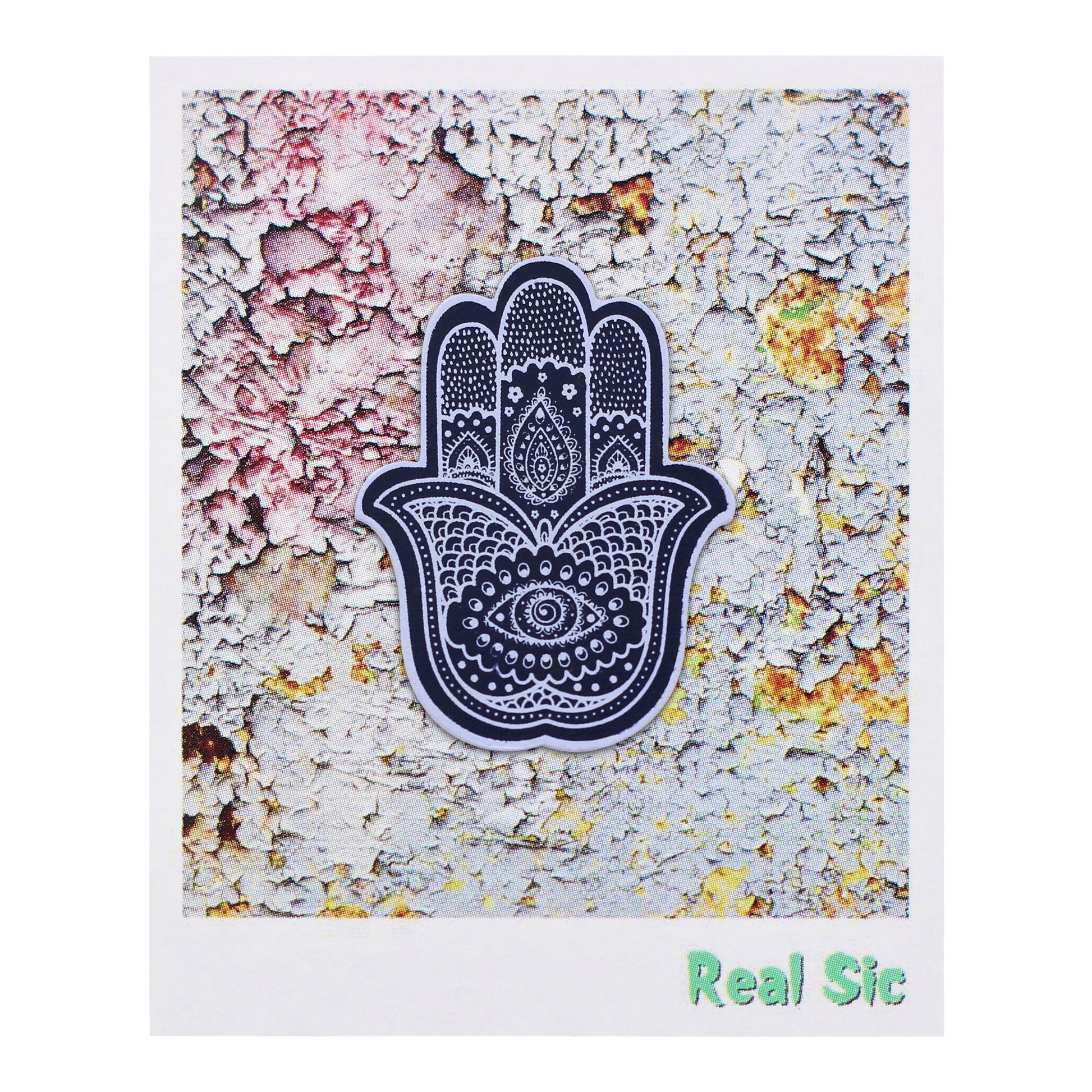 Ancient symbol of protection and strength, the Hamsa is a widely recognized symbol of defense against the evil eye. Our interpretation fits perfectly on a jacket or backpack. Stylish occult symbology reminiscent of henna tattoos.