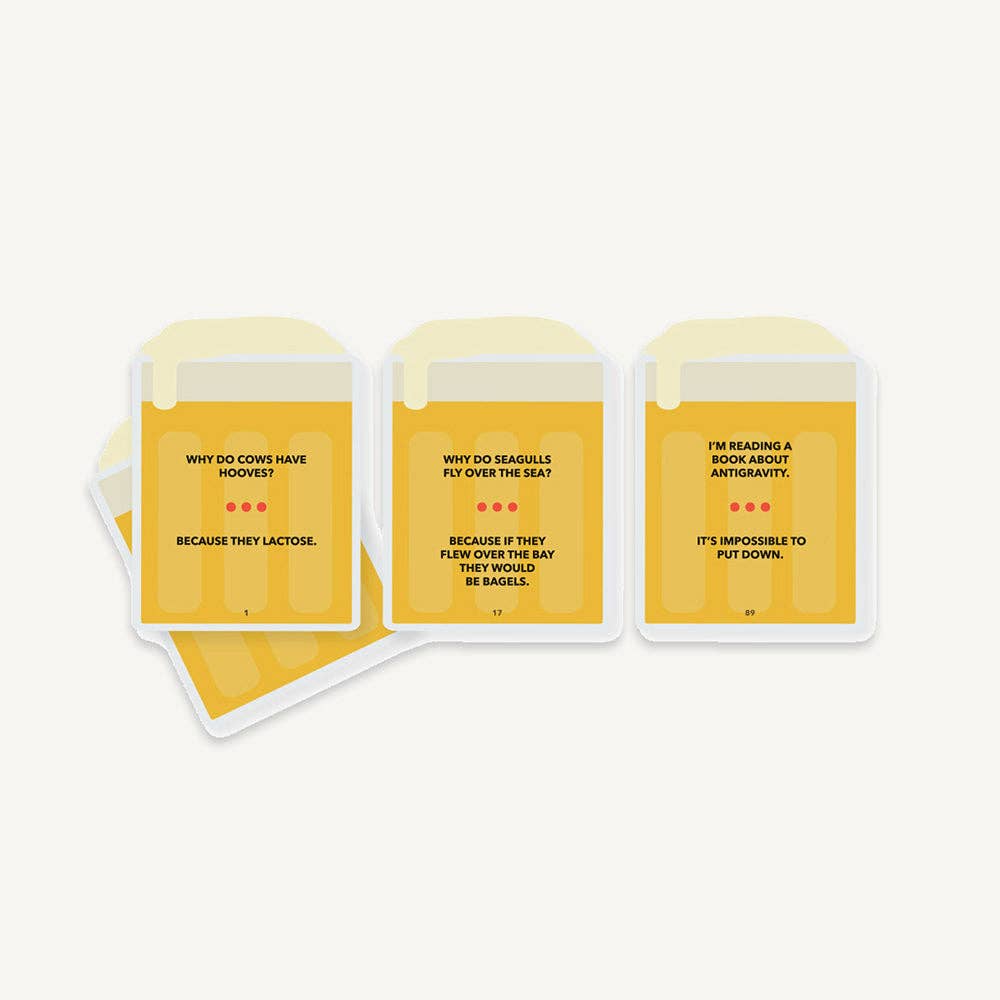 The 100 un-beer-able jokes are printed on beer shaped cards and come packaged in a novelty beer shaped box.  The perfect gift for dads to help expand their repertoire and anyone who fancies reminiscing about a childhood full of these no-nonsense 'bad' puns.