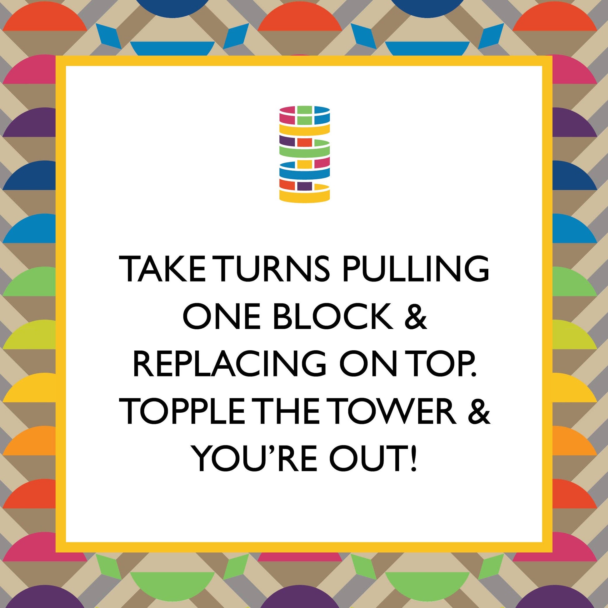 Enjoy this classic stacking game with a circular twist! Take turns removing one block from the tower and placing it in a new position at the top of the tower. It isn’t easy with two different shaped blocks—but it’s so much fun. For more of a challenge, assign a color to each player. The player who causes the tower to topple loses the game.