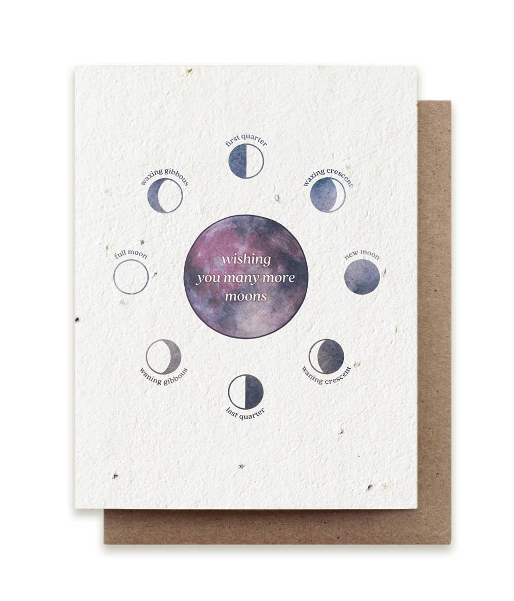 These birthday cards feature our original illustration of a purple and pink moon surrounded by the phases of the moon. They are printed on white seeded paper made from post-consumer waste. Embedded in this plantable paper is a mix of herb seeds: parsley, chive, & basil.