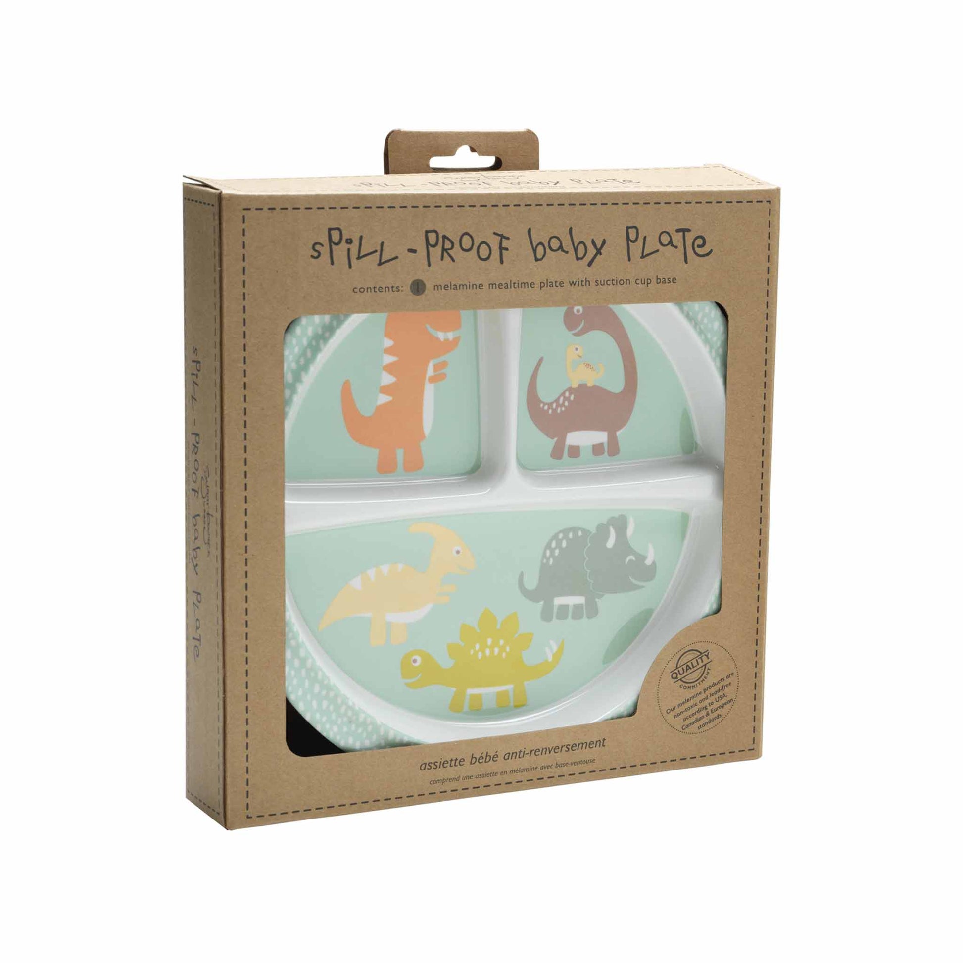 The Baby Dinosaur Divided Suction Plate features playful dinosaurs frolicking. The Divided Suction Plate has three divided sections and a removable suction base that is designed to help keep the plate in place on most smooth surfaces.