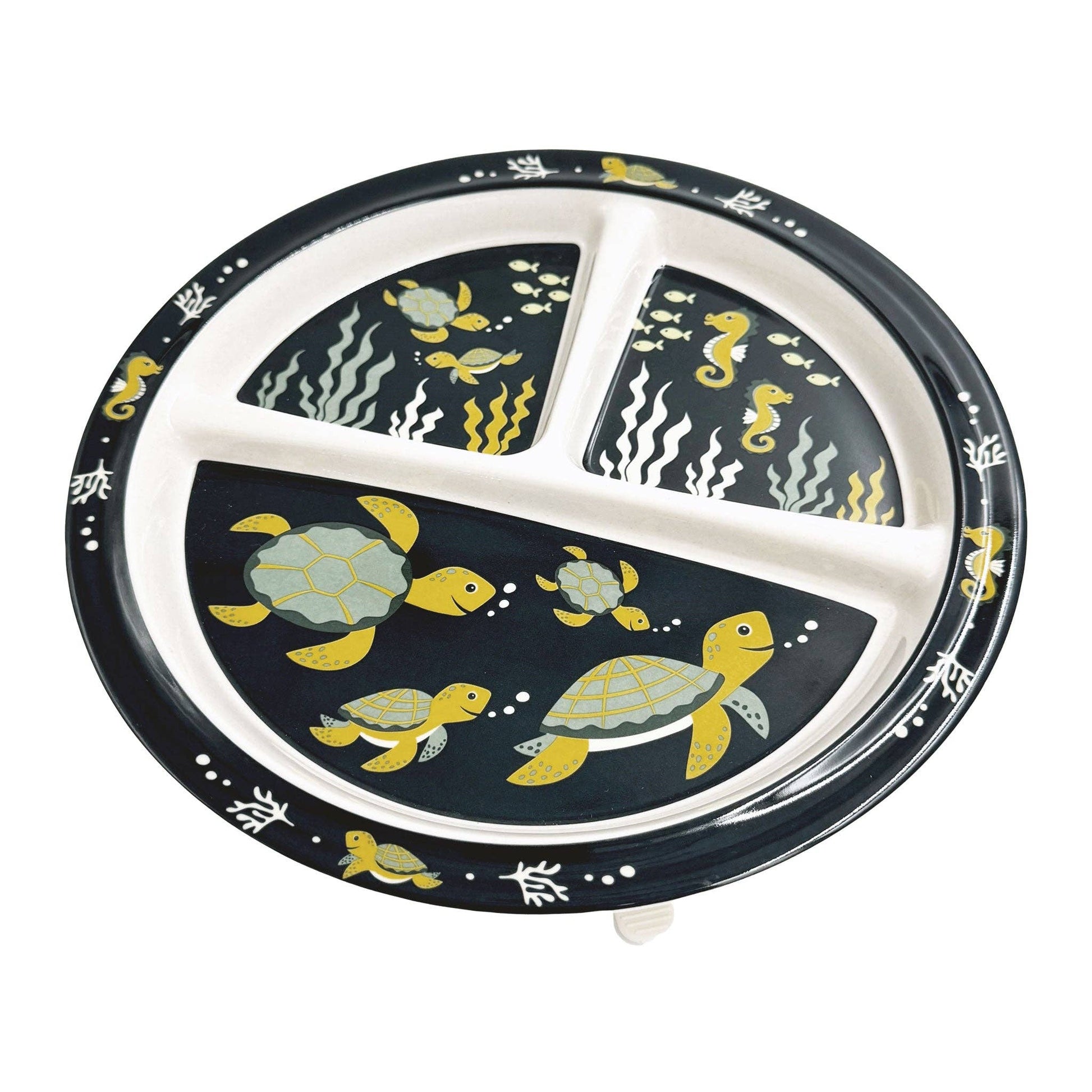 Dive into smoother meals—because every bite should feel like a swim with the turtles. Make mealtime a gentle underwater journey with the Turtle Time Divided Suction Plate. Featuring friendly sea turtles gliding through soft ocean waves, this plate helps keep food neatly separated while bringing a touch of ocean calm to the table. Designed with little ones in mind, it includes a removable silicone suction base to help minimize spills and messes as toddlers learn to eat on their own.