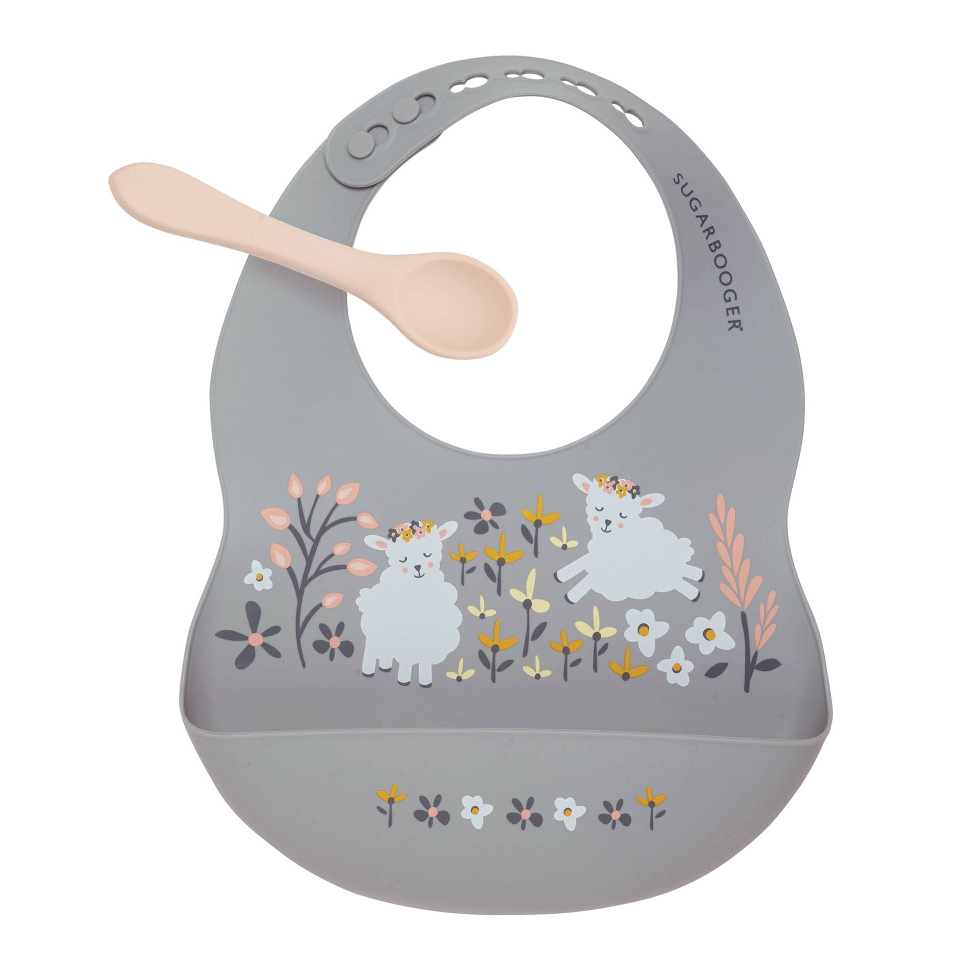Sugarbooger by Ore’ Originals - Fresh & Messy Silicone Bib & Spoon Set | Lily the Lamb
