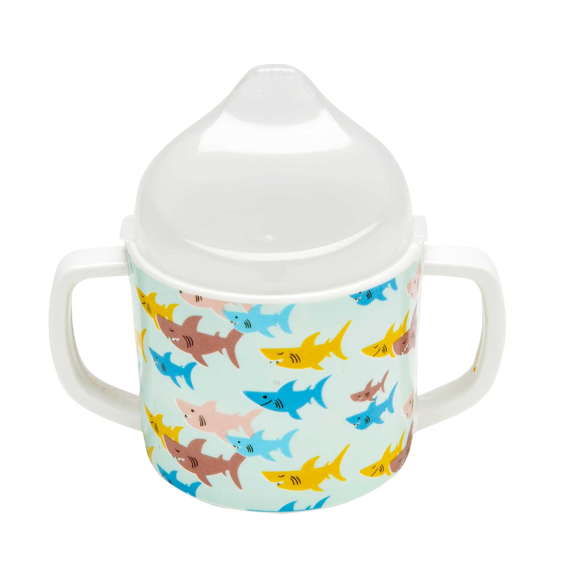 The Smiley Shark Sippy Cup features smiling sharks in a sharky color palette. The convertible sippy cup starts with a lid to regulate flow, which can be removed to allow kids to drink or use as a snack container.