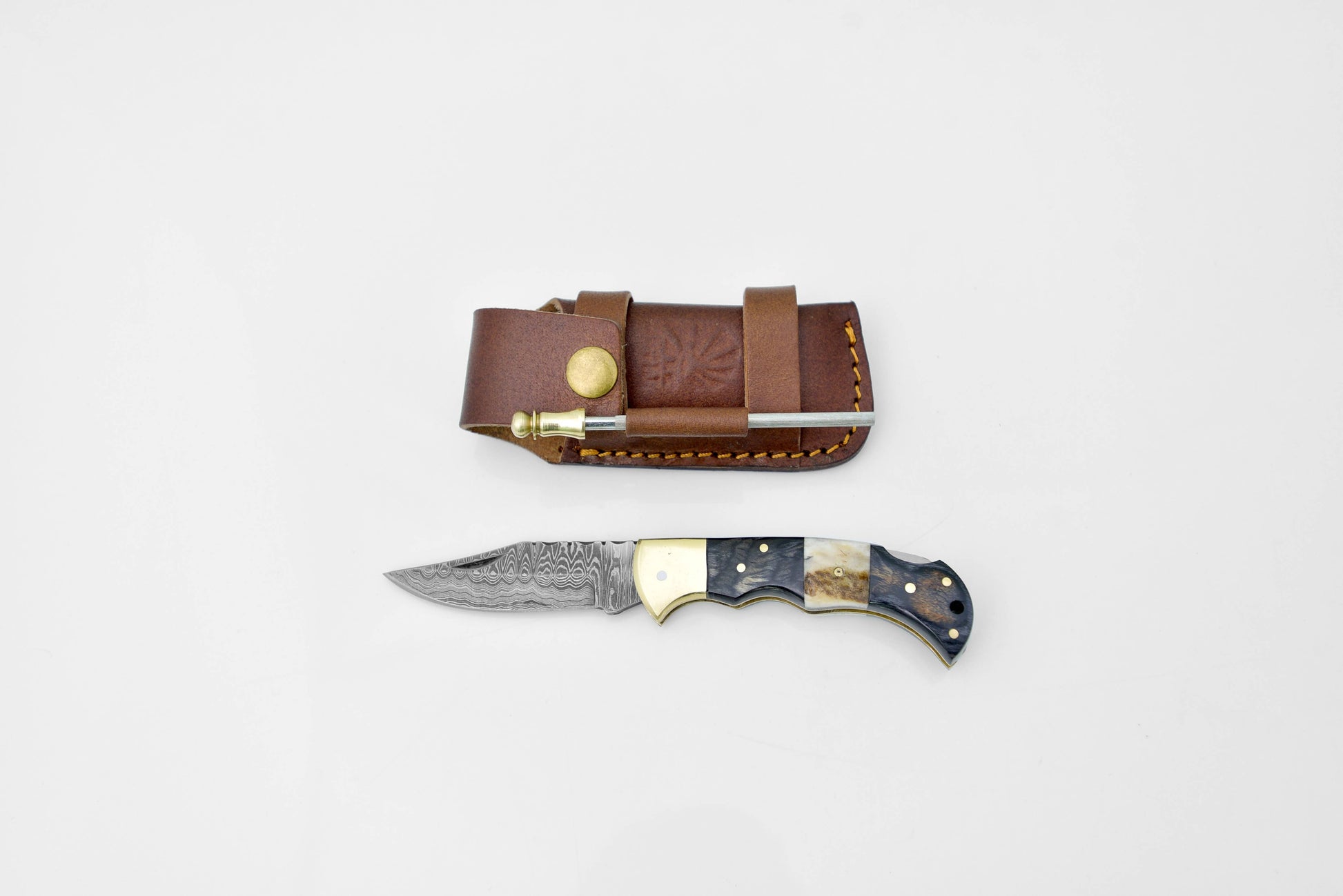 DAMASCUS FOLDING KNIFE, DAMASCUS POCKET KNIFE, CUSTOM DAMASCUS FOLDER, CLIP POINT BLADE, LOCK BACK FOLDING KNIFE, Engraved Camel Bone SCALES, HAND CARVED SPINE, LANYARD HOLE, HAND STITCHED LEATHER SHEATH