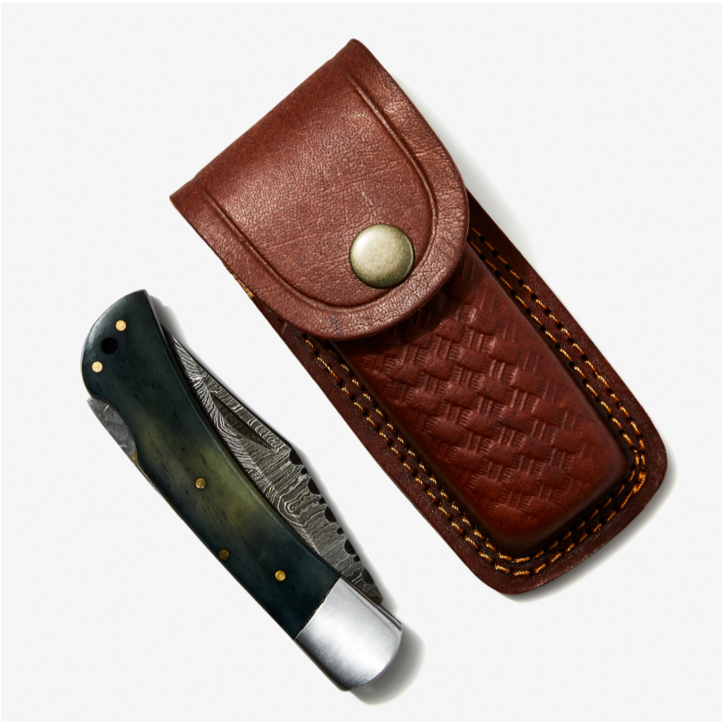 DAMASCUS FOLDING KNIFE, DAMASCUS POCKET KNIFE, CUSTOM DAMASCUS FOLDER, CLIP POINT BLADE, LOCK BACK FOLDING KNIFE, Dyed Bone SCALES, HAND CARVED SPINE, HAND STITCHED LEATHER SHEATH
