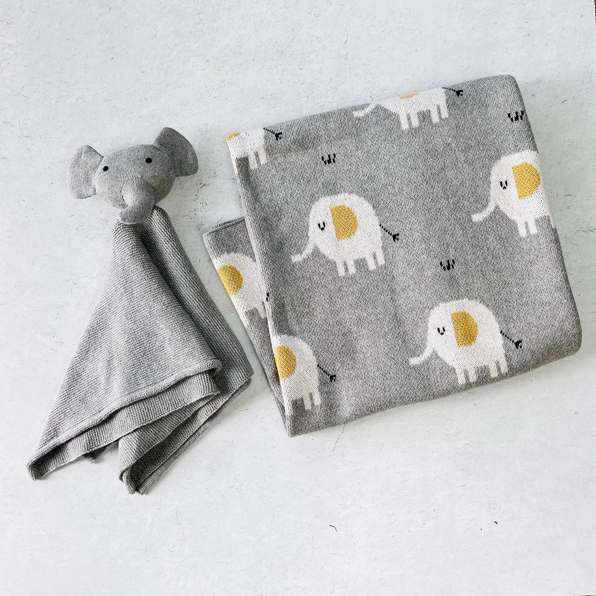 Viverano Organics - Elephant Jacquard Knit Baby Blanket & Lovey Gift SET